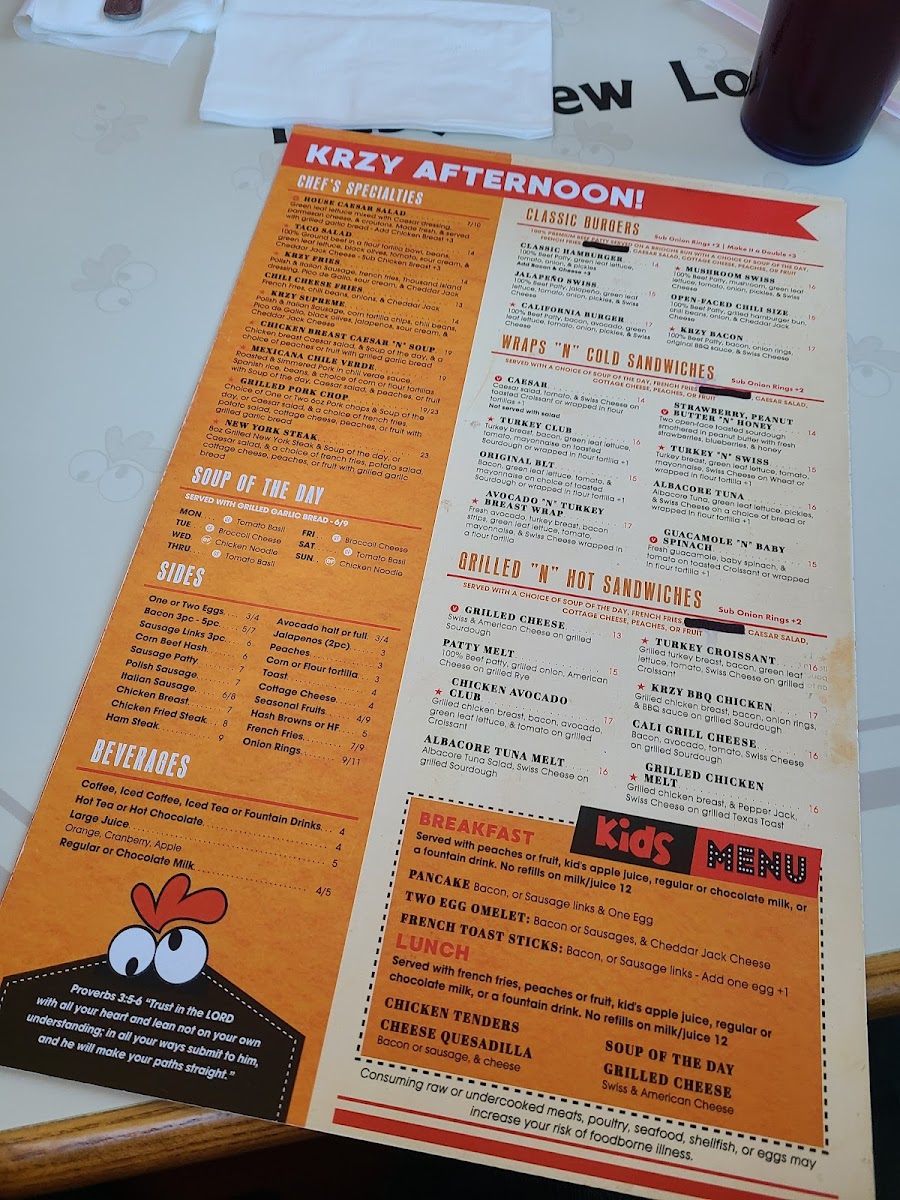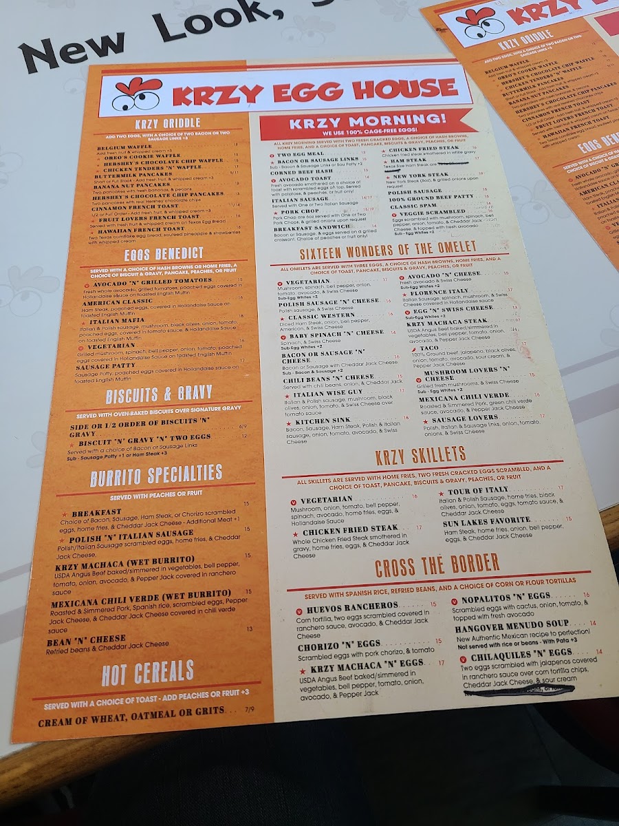 Lastly, for a sweet finish, the Krzy Griddle section serves up indulgent treats like the Hawaiian French Toast, Waffle Fruit Lover, and the ever-popular Combo Pancakes.